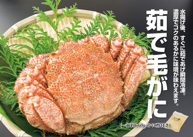 かに料理専門店『かに政宗』厳選の毛蟹です。 贈答用に、お祝い用に、大人気の特大サイズのかにをご用意しました。 解凍後、そのままお召し上がりいただけます。 付属のかに酢、またはお好みでポン酢につけても美味しくいただけます。 【内容品】 ・茹で毛がに 1尾 ・かに酢 1袋 ・お召し上がり方冊子 【内容量】 約660g ※冷凍状態でのグラム数です。解凍後は重量が減少します。 【販売価格】 本体価格¥8,000に送料¥1,200を加えた価格です。 ※※※配送日の注意点※※※ お届け希望日は、備考欄にご記入ください。 ご指定がない場合は、ご注文日から最短5日でお届けいたします。
